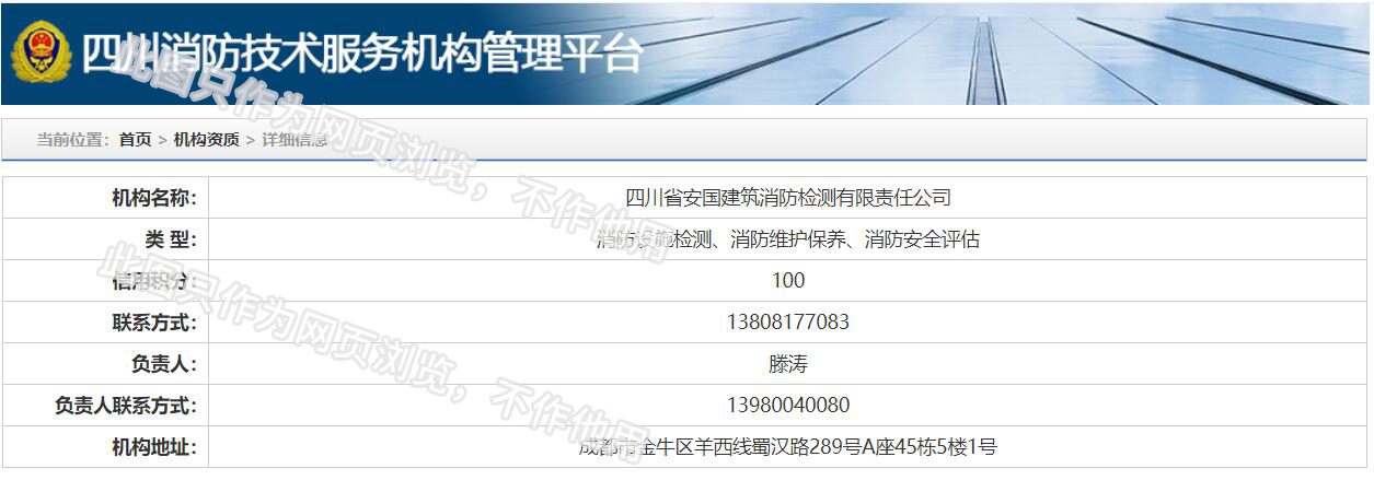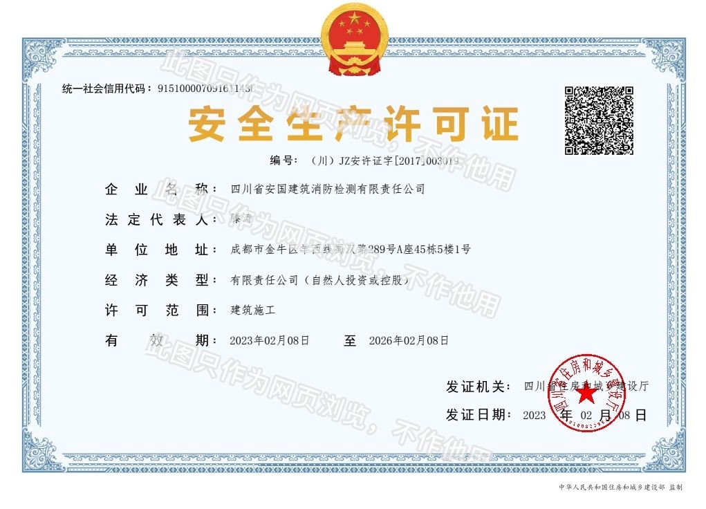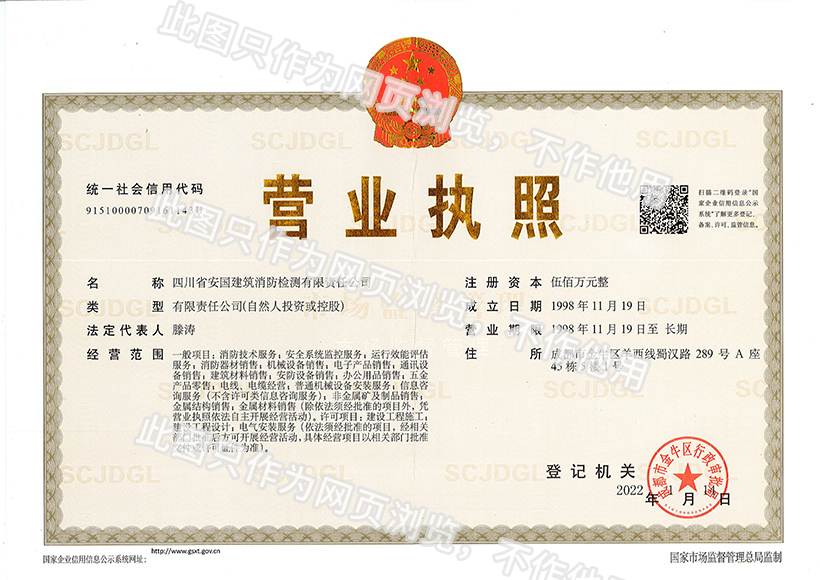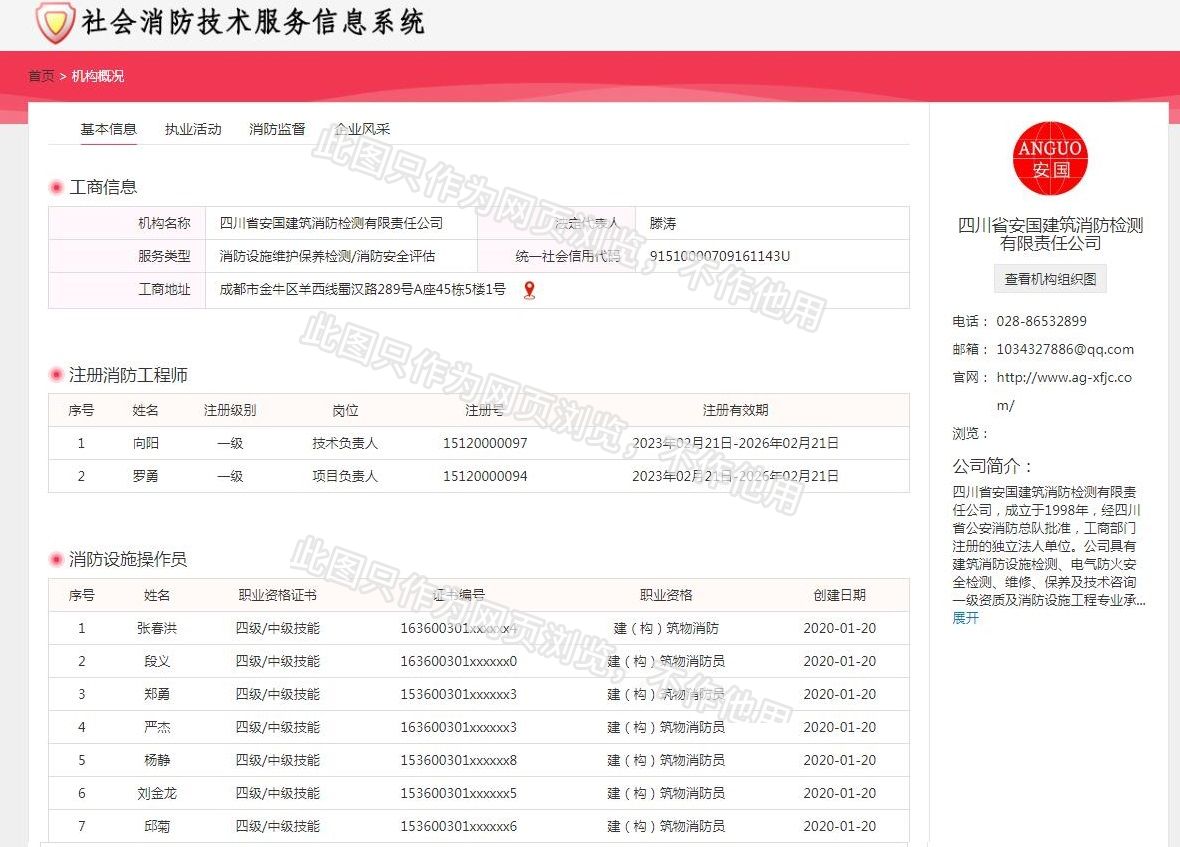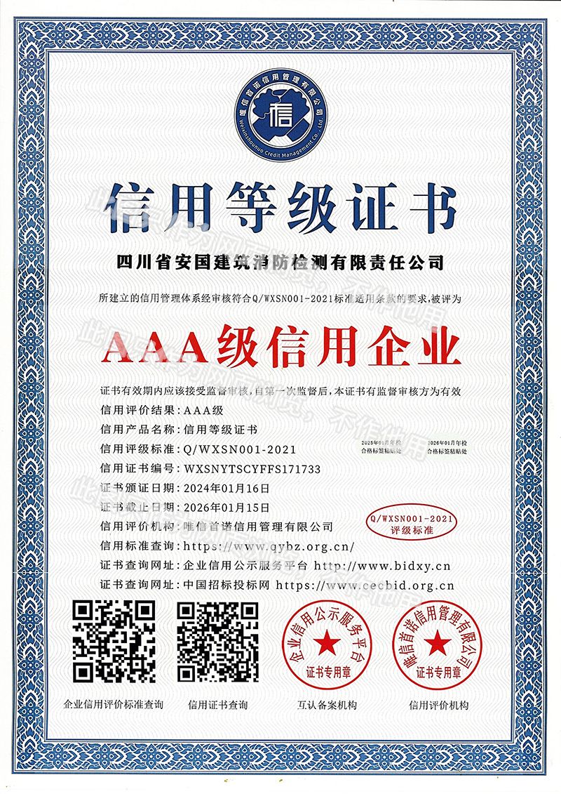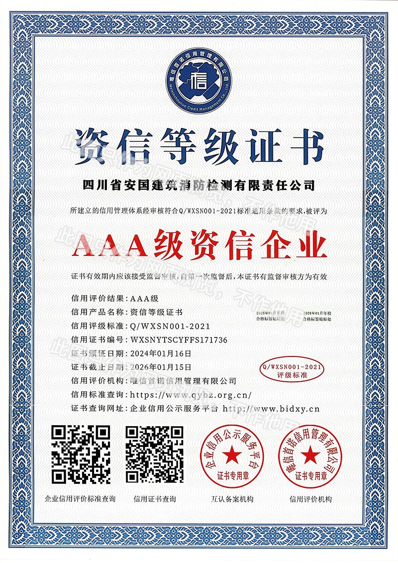 四川省安國建筑消防檢測有限責(zé)任公司,成立于1998年,經(jīng)四川省公安消防總隊(duì)批準(zhǔn),工商部門注冊的獨(dú)立法人單位。 公司具有建筑消防設(shè)施檢測、電氣防火安全檢測、維修、保養(yǎng)及技術(shù)咨詢一級資質(zhì)的中介技術(shù)服務(wù)機(jī)構(gòu),獲得CMA計(jì)量認(rèn)證。主要業(yè)務(wù)范圍是:接受建設(shè)單位或有關(guān)單位委托,承擔(dān)新建、改建、擴(kuò)建建筑自動消防設(shè)施技術(shù)檢測、電氣防火安全檢測、以及承接建筑消防設(shè)施維護(hù)保養(yǎng),對已交付使用的建設(shè)消防設(shè)施的運(yùn)行情況進(jìn)行運(yùn)行檢測,開展建筑消防設(shè)施的消防安全技術(shù)咨詢。公司設(shè)辦公室、總工辦、財(cái)務(wù)部、檢測部、維保部等職能機(jī)構(gòu),擁有一